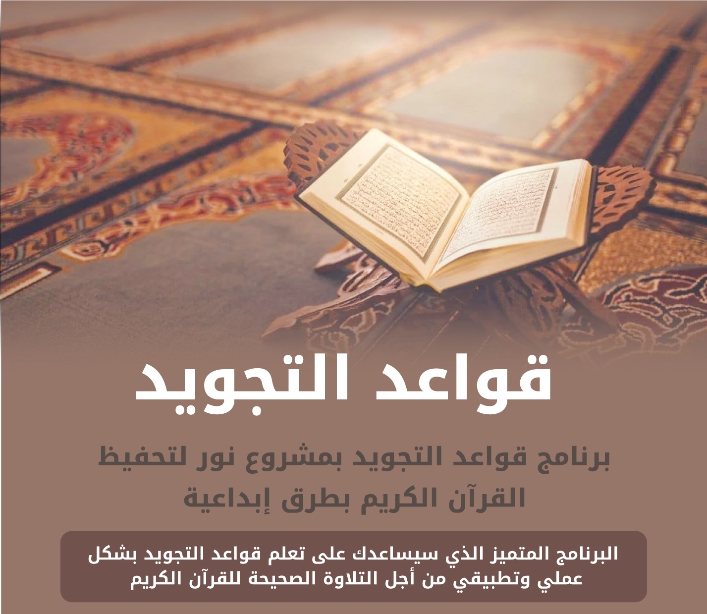 برنامج قواعد التجويد بمشروع نور لتحفيظ القرآن الكريم بطرق إبداعية البرنامج المتميز الذي سيساعدك على تعلم قواعد التجويد بشكل عملي وتطبيقي من أجل التلاوة الصحيحة للقرآن الكريم